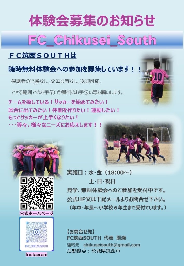 FC筑西SOUTHでは、随時無料体験会の参加を募集しています。
